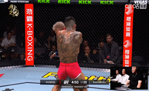 第二回合中村京一郎加快了进攻频率,李凯文的眼部再遭重创。这一回合李凯文陷入了被动,他再次试图抱摔,但是没能在地面压制住中村京一郎。不过李凯文的斗志十分顽强,尽管多次被重创,仍旧和对手拼到回合结束。
